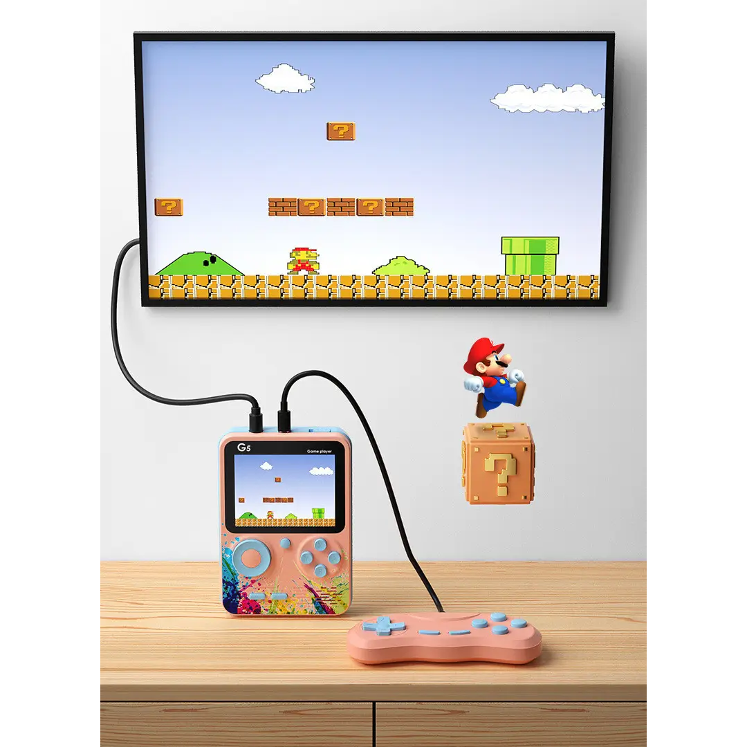 Această consolă de jocuri este concepută pentru a oferi o experiență de joc nostalgică cu jocuri retro clasice. Vine cu 500 de jocuri preinstalate și acceptă mai multe limbi pentru un public mai larg. Pachetul include controlerul, consola, încărcătorul și cablul de alimentare, toate ambalate frumos într-o cutie colorată. Este compatibil cu un singur controler și acceptă ieșirea video AV prin televizor, ceea ce face ușoară conectarea și redarea pe un ecran mai mare.