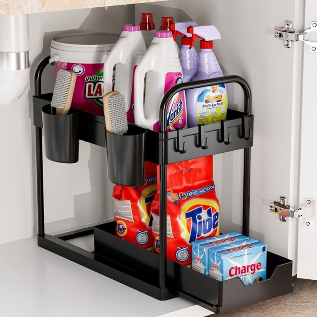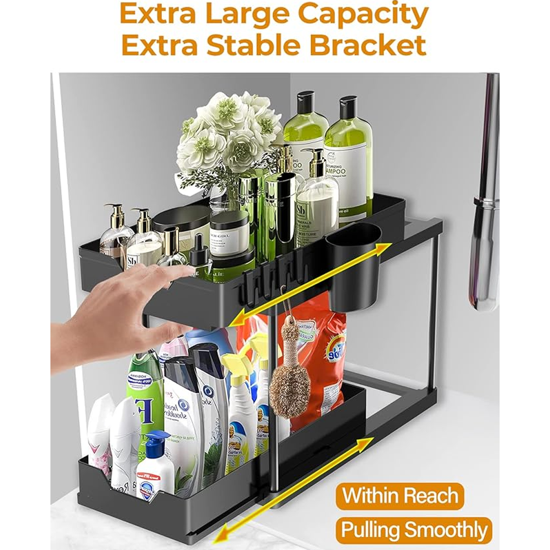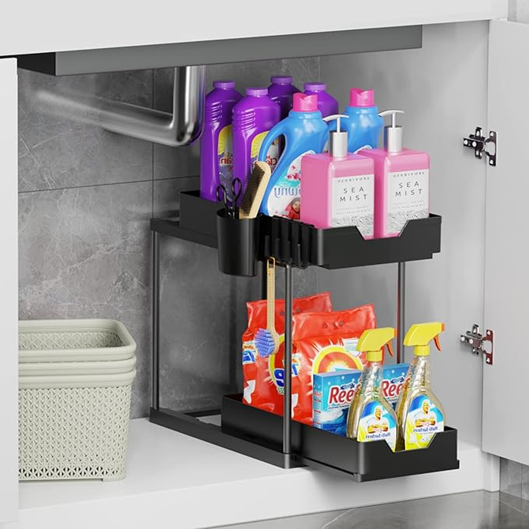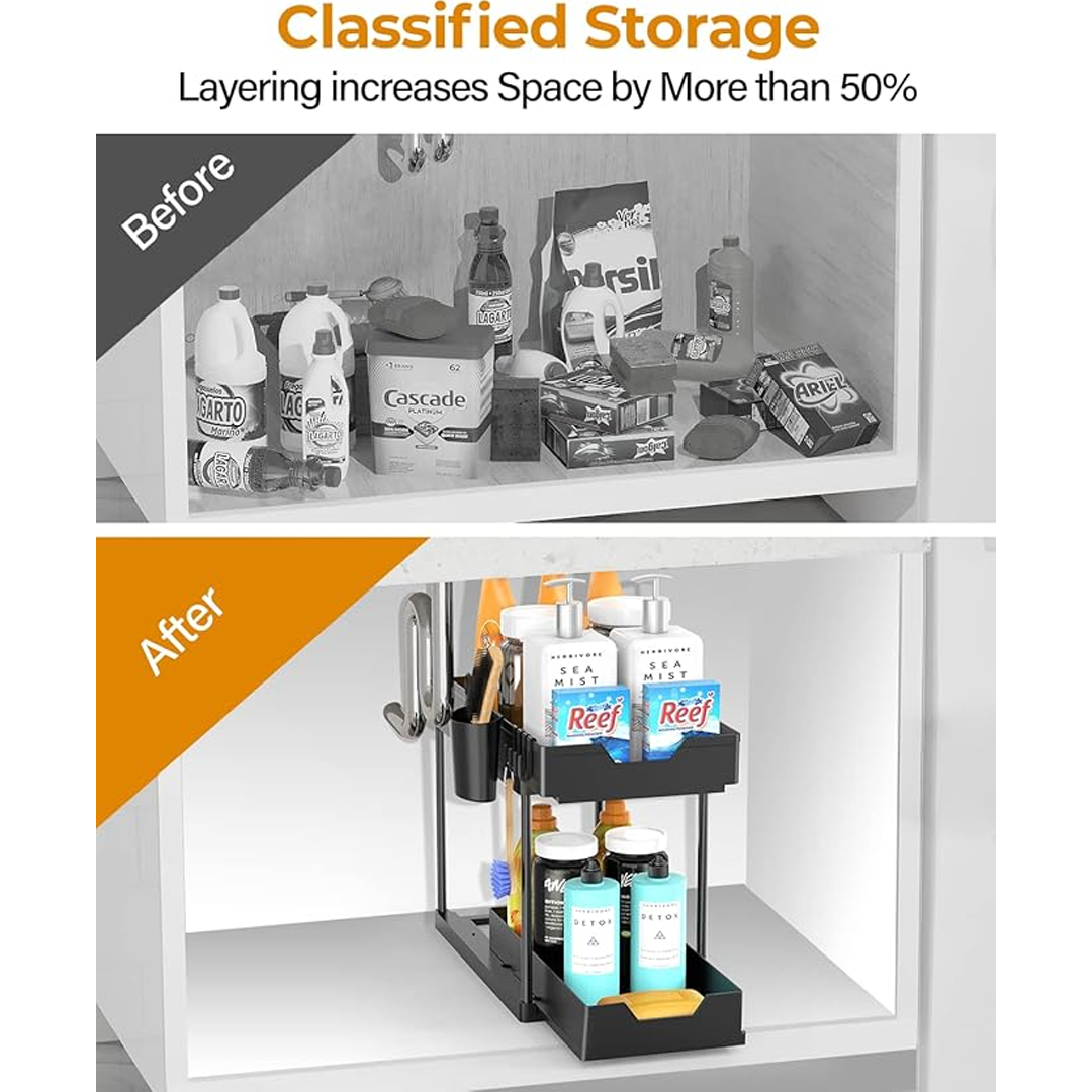 Acest organizator multifuncțional pentru sub chiuvetă este ideal pentru oricine dorește să profite la maximum de spațiu și să-și păstreze lucrurile bine organizate și ușor accesibile.